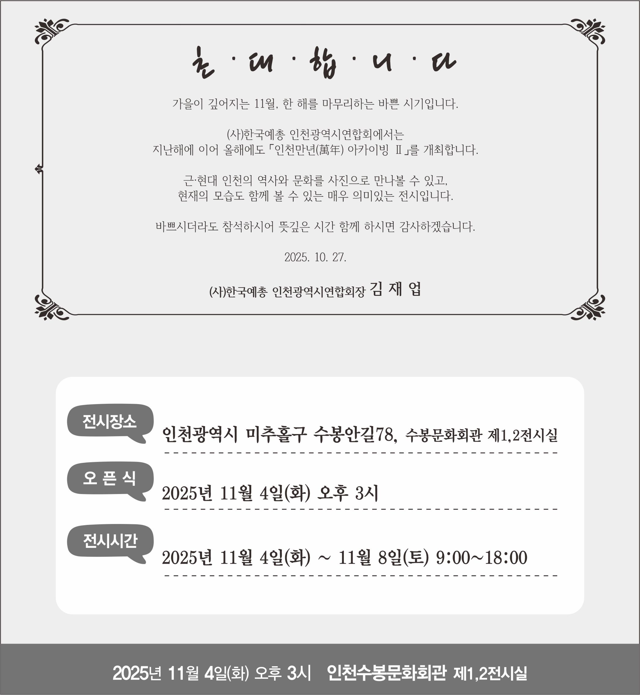 | 제목 | [전시안내] 2025 인천만년(萬年)아카이빙Ⅱ | ||||