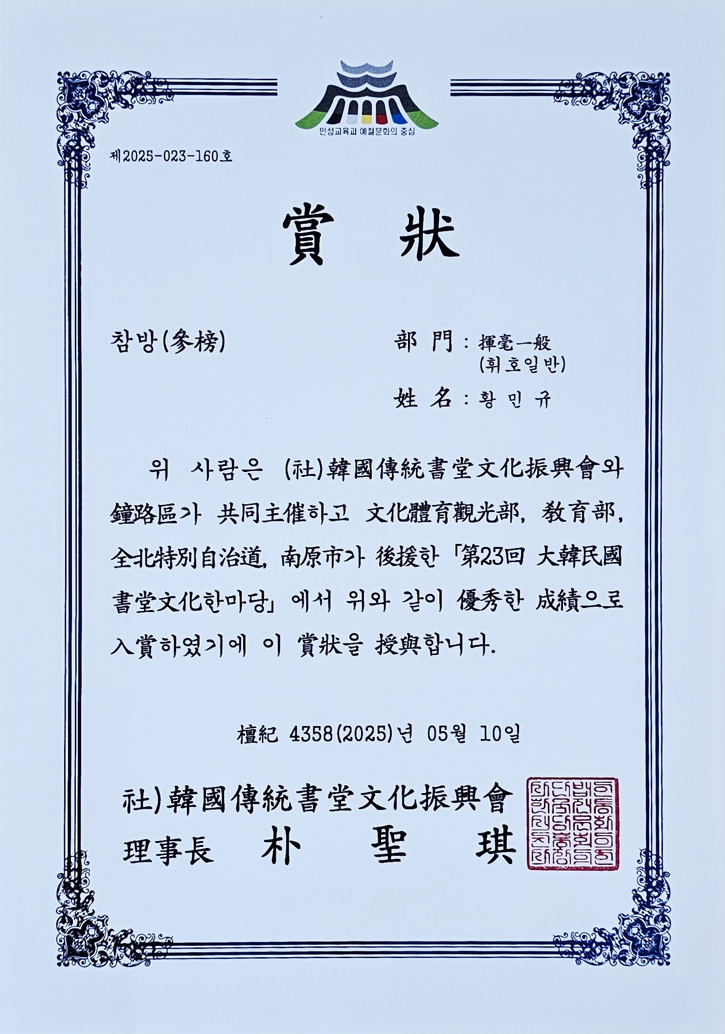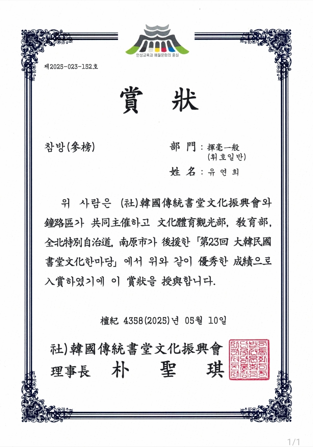 제23회 대한민국 서당문화한마당 휘호대회 일반부 - 참방 유연희 황민규