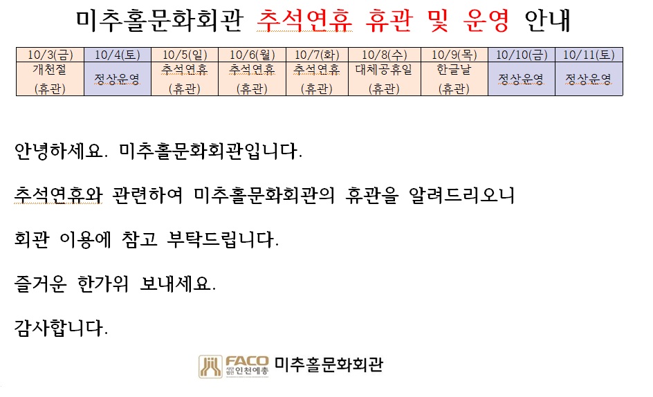 | 제목 | [휴관일정] 미추홀문화회관 추석연휴 휴관안내 | ||||