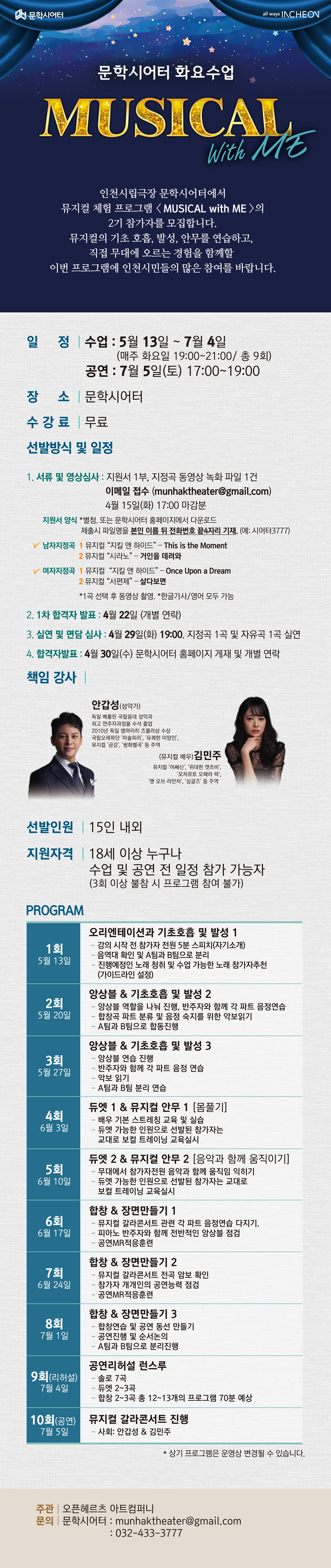 | 제목 | [타기관안내] 문학시어터 화요수업 <MUSICAL with ME> 2기 모집 | ||||