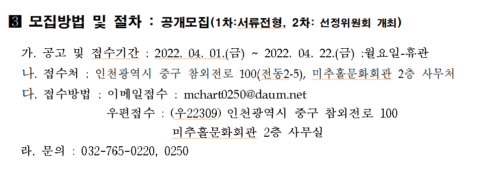 | 글쓴이 | 미추홀문화회관 | 등록일 | 2022-03-30 | 조회수 | 3139 |