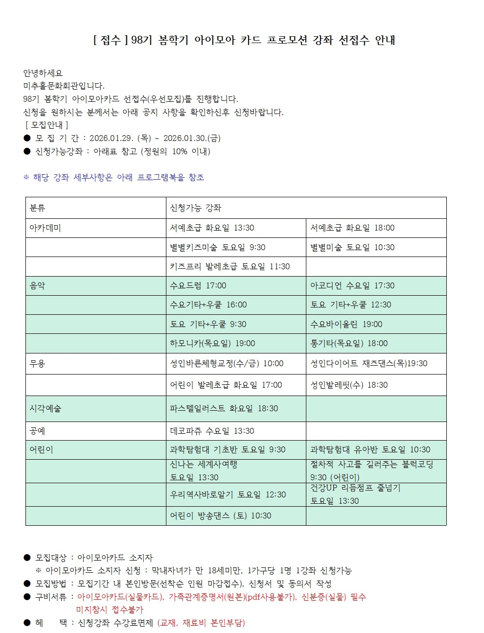 | 제목 | [안내] 2026 봄학기 아이모아 카드 프로모션 강좌 선접수 안내 | ||||