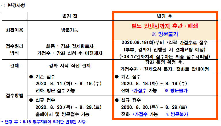 8월 18일 발표된 정부지침 코로나19의 확산 및 2단계 격상에 따라 시민들의 건강 보호 및 안전을 위하여 방문이 불가되오며, 별도 안내시까지 휴관폐쇄됩니다. 양해 부탁드립니다.